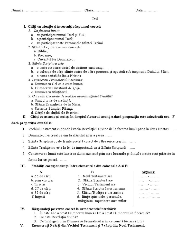 Citeste cu atentie afirmatile urmatoare.. Test scris la religie ortodoxa. Timpul efectiv de lucru este de 50 de minute. Timpul efectiv de lucru este de 50 de minute. In cazul in care apreciezi ca afirmatiile sunt adevarate, incercuieste litera a, daca apreciezi …