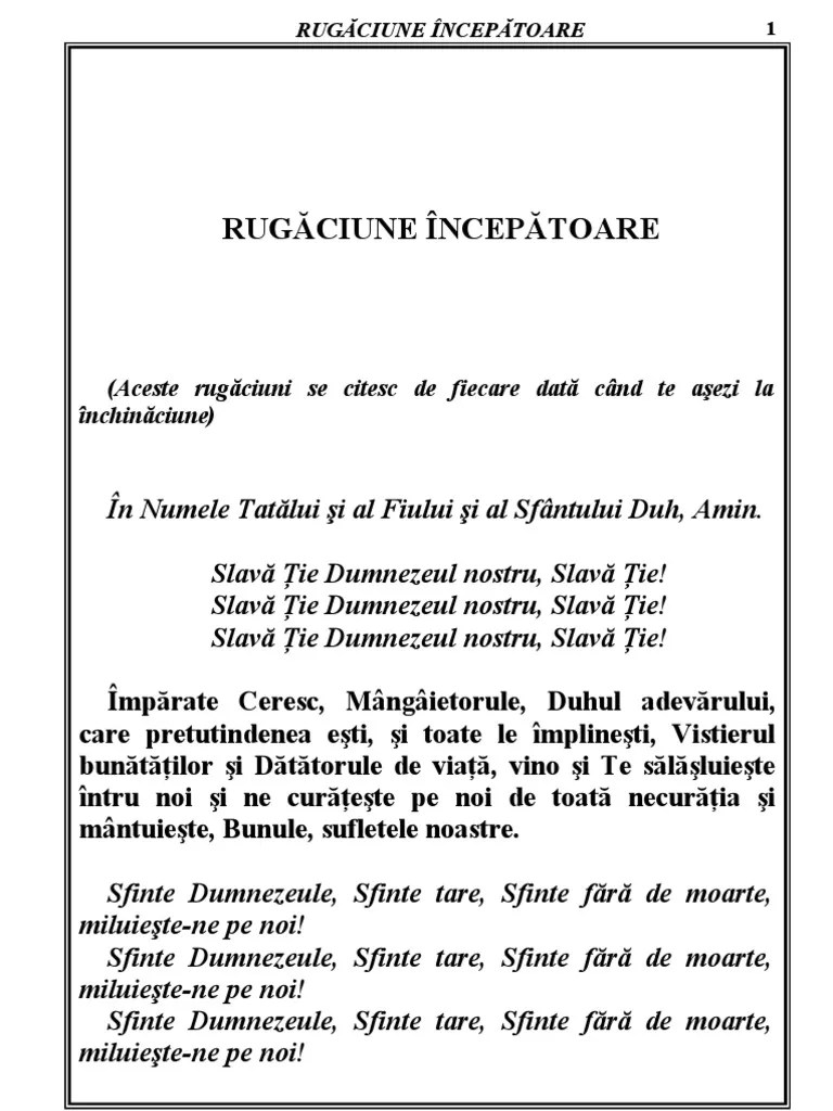 Originea și autorul acestei rugăciuni nu sunt cunoscute, însă există motive să credem că își are obârșia aproape de sfârșitul primului mileniu al erei creștine... Această rugăciune nu se citește în perioada dintre paști și rusalii: Originea și autorul acestei rugăciuni nu sunt cunoscute, însă există motive să credem că își are obârșia aproape de sfârșitul primului mileniu al erei creștine. Împărate ceresc, mângâietorule, duhul adevărului, care pretutindenea ești și toate le plinești, vistierul bunătăților și dătătorule de viață, vino și te sălășluiește întru noi, și ne curățește pe noi de toată întinăciunea, și mântuiește, bunule, sufletele noastre. Imparate ceresc, mangaietorule, duhul adevarului, care pretutindeni esti si toate le plinesti, vistierul bunatatilor si datatorule de viata, vino si te salasluieste intru noi si ne curateste de toata intinarea si mantuieste,. Cu lucrul, cu cuvantul, si cu gandul, si curateste, doamne, smeritul meu suflet, de toata intinaciunea trupului si a. 14.11.2016 · about press copyright contact us creators advertise developers terms privacy policy & safety how youtube works test new features press copyright contact us creators. Această rugăciune nu se citește în perioada dintre paști și rusalii: