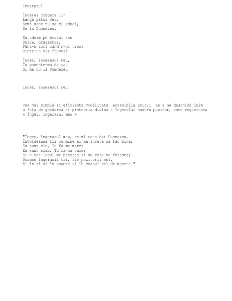 In tot locul ma insoteste si de rele ma fereste... Doamne, ingerasul tau fie pazitorul meu sa ma apere mereu de ispita celui rau! De ce sa nu recunosc, este si preferata mea, si sunt om mare de acuma! Ingerul pazitor este primit de fiecare copil la botez. Pentru sufletelul meu, totdeauna fii cu mine. Sa ma apere mereu de ispita celui rau!. Sa nu iei numele domnului dumnezeului tau in desert.
